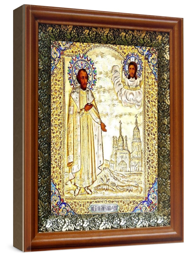 Икона михаил тверской (19х22), светлый киот. Лик нанесен методом шелкографии на цельную липовую доску, покрытую левкасом (специальным грунтом под живопись). Использованы минеральные (природные) краски. Размер иконы без киота (см): 13х16, с киотом: 19х22. Киот со стеклом, выполнен из березы и украшен басмой (узор из черненой меди в виде виноградной лозы). Икона освящена.