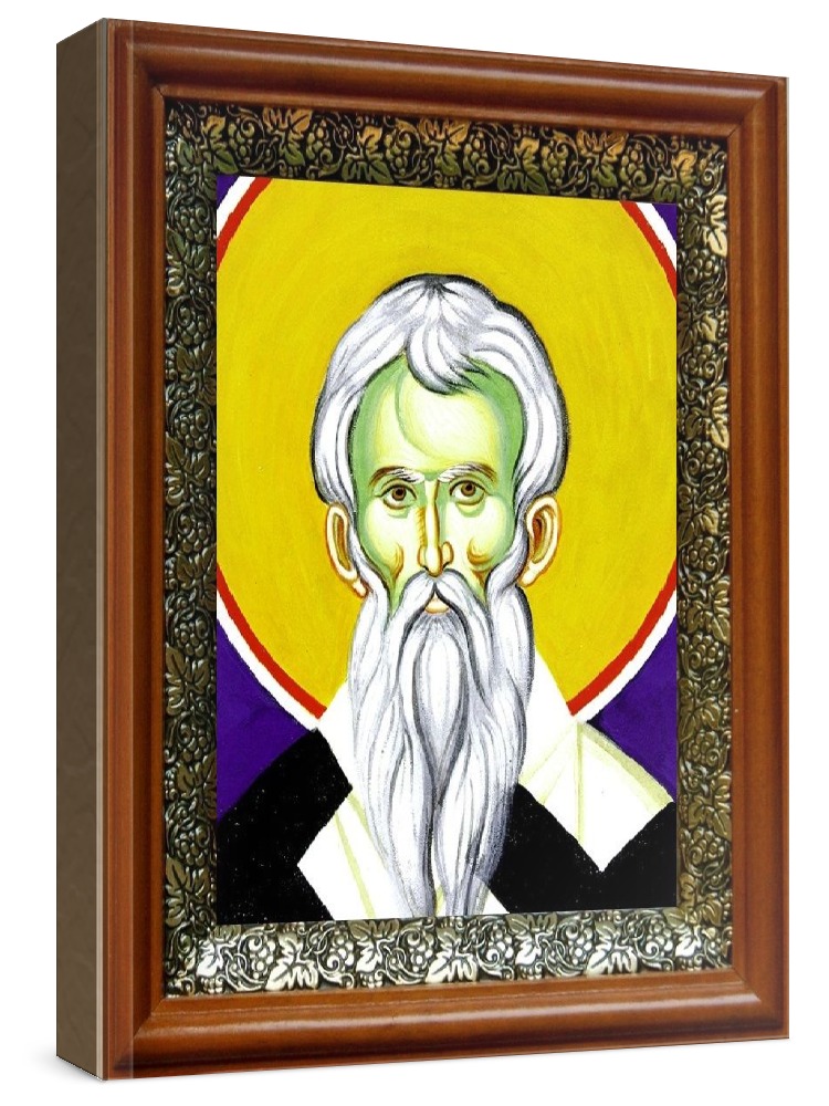 Икона модест иерусалимский (19х22), светлый киот. Лик нанесен методом шелкографии на цельную липовую доску, покрытую левкасом (специальным грунтом под живопись). Использованы минеральные (природные) краски. Размер иконы без киота (см): 13х16, с киотом: 19х22. Киот со стеклом, выполнен из березы и украшен басмой (узор из черненой меди в виде виноградной лозы). Икона освящена.