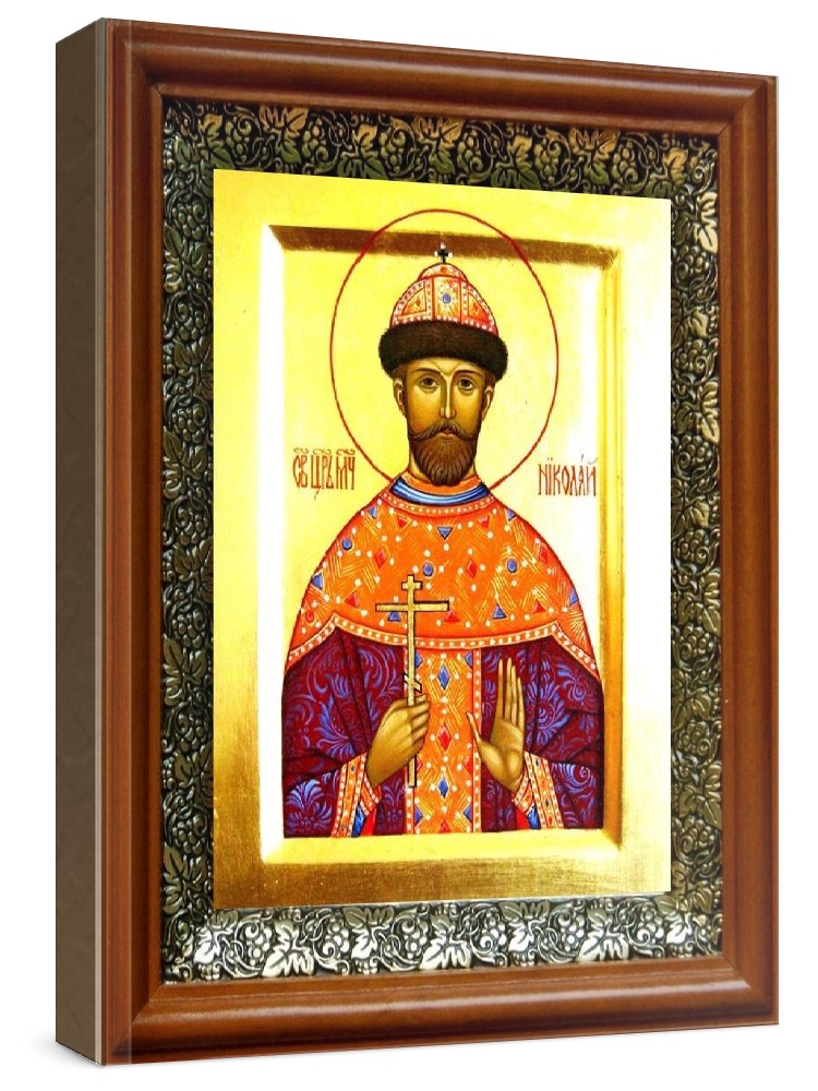 Икона николай 2, царь (19х22), светлый киот.     Лик нанесен методом шелкографии на цельную липовую доску, покрытую левкасом (специальным грунтом под живопись). Использованы минеральные (природные) краски.  Размер иконы без киота (см): 13х16, с киотом: 19х22.  Киот со стеклом, выполнен из березы и украшен басмой (узор из черненой меди в виде виноградной лозы).  Икона освящена.