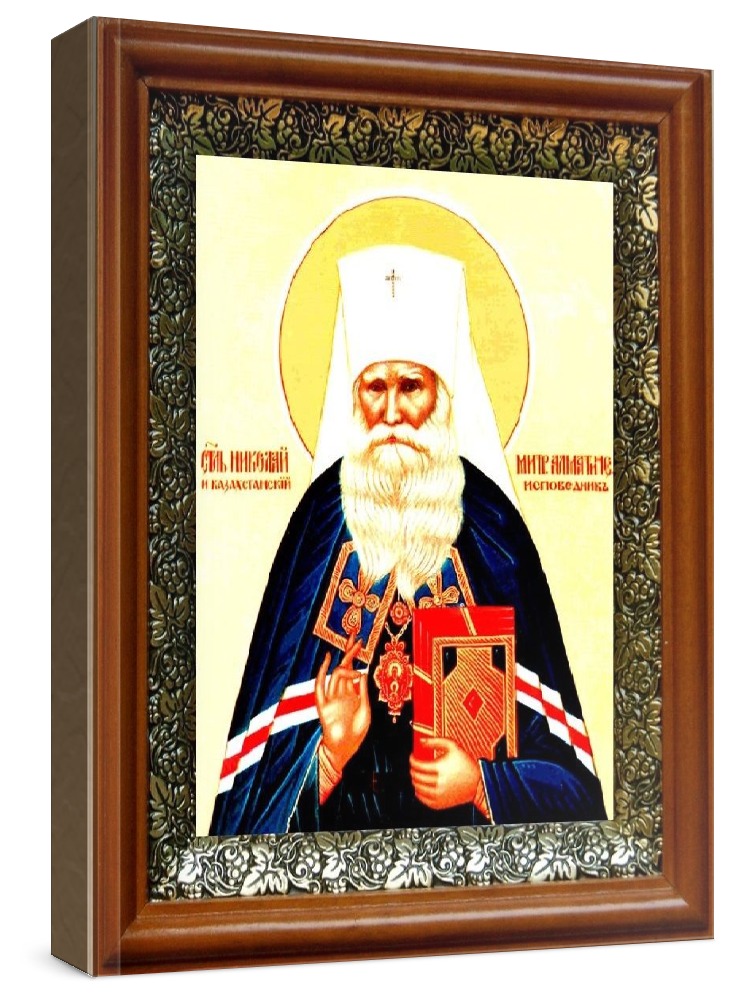 Икона николай алма-атинский (19х22), светлый киот. Лик нанесен методом шелкографии на цельную липовую доску, покрытую левкасом (специальным грунтом под живопись). Использованы минеральные (природные) краски. Размер иконы без киота (см): 13х16, с киотом: 19х22. Киот со стеклом, выполнен из березы и украшен басмой (узор из черненой меди в виде виноградной лозы). Икона освящена.