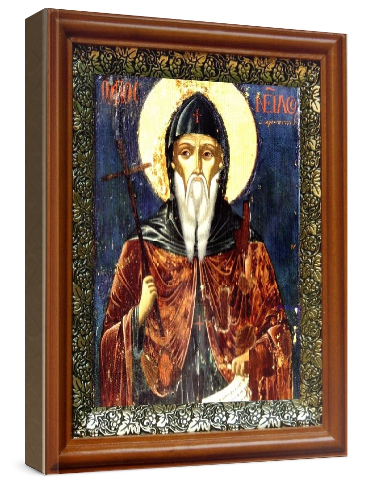 Икона нил мироточивый (19х22), светлый киот. Лик нанесен методом шелкографии на цельную липовую доску, покрытую левкасом (специальным грунтом под живопись). Использованы минеральные (природные) краски. Размер иконы без киота (см): 13х16, с киотом: 19х22. Киот со стеклом, выполнен из березы и украшен басмой (узор из черненой меди в виде виноградной лозы). Икона освящена.