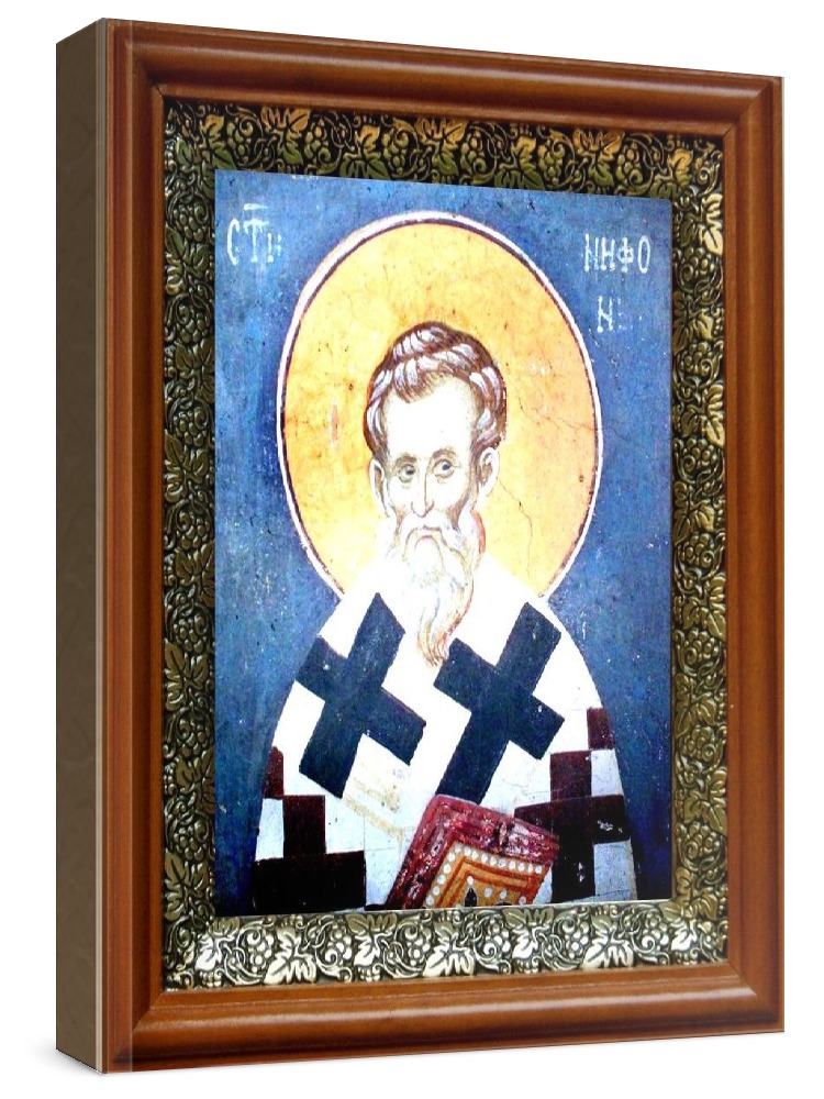 Икона нил мироточивый (19х22), светлый киот. Лик нанесен методом шелкографии на цельную липовую доску, покрытую левкасом (специальным грунтом под живопись). Использованы минеральные (природные) краски. Размер иконы без киота (см): 13х16, с киотом: 19х22. Киот со стеклом, выполнен из березы и украшен басмой (узор из черненой меди в виде виноградной лозы). Икона освящена.