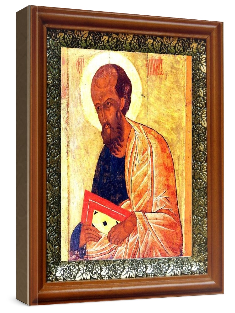 Икона павел, апостол (19х22), светлый киот. Лик нанесен методом шелкографии на цельную липовую доску, покрытую левкасом (специальным грунтом под живопись). Использованы минеральные (природные) краски. Размер иконы без киота (см): 13х16, с киотом: 19х22. Киот со стеклом, выполнен из березы и украшен басмой (узор из черненой меди в виде виноградной лозы). Икона освящена.