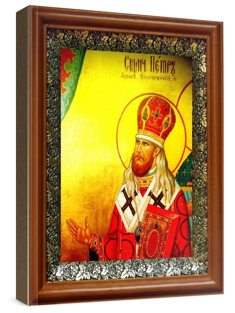 Икона петр воронежский (19х22), светлый киот. Лик нанесен методом шелкографии на цельную липовую доску, покрытую левкасом (специальным грунтом под живопись). Использованы минеральные (природные) краски. Размер иконы без киота (см): 13х16, с киотом: 19х22. Киот со стеклом, выполнен из березы и украшен басмой (узор из черненой меди в виде виноградной лозы). Икона освящена.