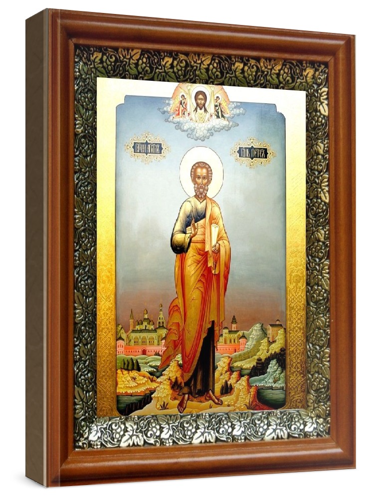 Икона петр, апостол (19х22), светлый киот. Лик нанесен методом шелкографии на цельную липовую доску, покрытую левкасом (специальным грунтом под живопись). Использованы минеральные (природные) краски. Размер иконы без киота (см): 13х16, с киотом: 19х22. Киот со стеклом, выполнен из березы и украшен басмой (узор из черненой меди в виде виноградной лозы). Икона освящена.