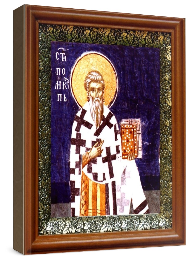 Икона поликарп смирнский (19х22), светлый киот. Лик нанесен методом шелкографии на цельную липовую доску, покрытую левкасом (специальным грунтом под живопись). Использованы минеральные (природные) краски. Размер иконы без киота (см): 13х16, с киотом: 19х22. Киот со стеклом, выполнен из березы и украшен басмой (узор из черненой меди в виде виноградной лозы). Икона освящена.