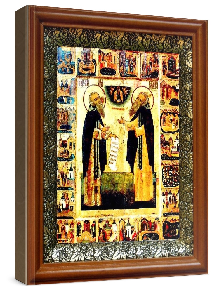 Икона зосима и савватий соловецкие (19х22), светлый киот. Лик нанесен методом шелкографии на цельную липовую доску, покрытую левкасом (специальным грунтом под живопись). Использованы минеральные (природные) краски. Размер иконы без киота (см): 13х16, с киотом: 19х22. Киот со стеклом, выполнен из березы и украшен басмой (узор из черненой меди в виде виноградной лозы). Икона освящена.