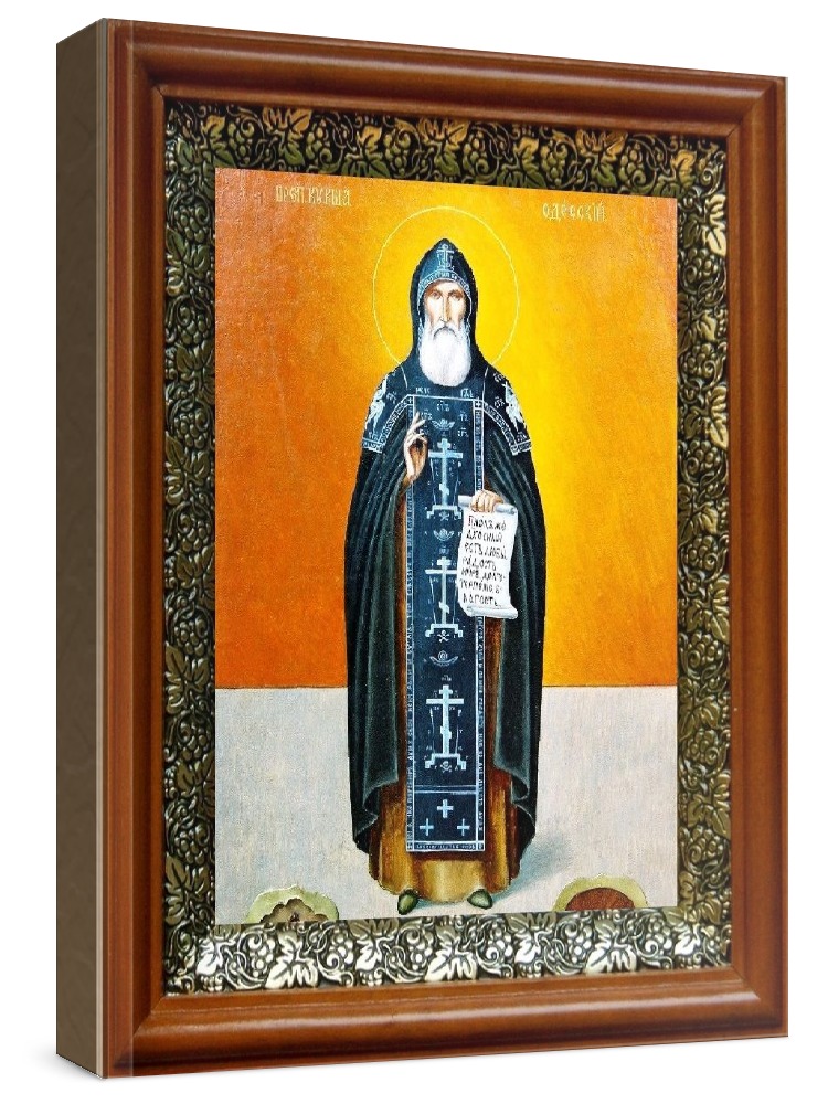 Икона прокопий сазавский (19х22), светлый киот. Лик нанесен методом шелкографии на цельную липовую доску, покрытую левкасом (специальным грунтом под живопись). Использованы минеральные (природные) краски. Размер иконы без киота (см): 13х16, с киотом: 19х22. Киот со стеклом, выполнен из березы и украшен басмой (узор из черненой меди в виде виноградной лозы). Икона освящена.