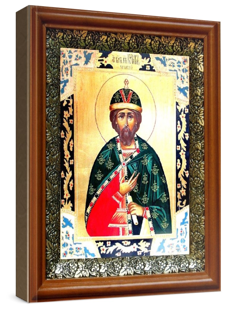 Икона роман рязанский (19х22), светлый киот. Лик нанесен методом шелкографии на цельную липовую доску, покрытую левкасом (специальным грунтом под живопись). Использованы минеральные (природные) краски. Размер иконы без киота (см): 13х16, с киотом: 19х22. Киот со стеклом, выполнен из березы и украшен басмой (узор из черненой меди в виде виноградной лозы). Икона освящена.