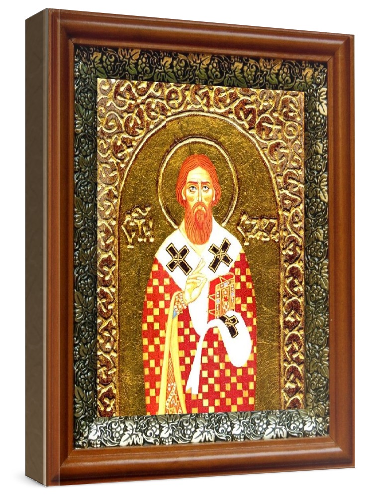 Икона савва сербский (19х22), светлый киот. Лик нанесен методом шелкографии на цельную липовую доску, покрытую левкасом (специальным грунтом под живопись). Использованы минеральные (природные) краски. Размер иконы без киота (см): 13х16, с киотом: 19х22. Киот со стеклом, выполнен из березы и украшен басмой (узор из черненой меди в виде виноградной лозы). Икона освящена.