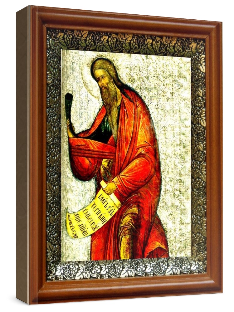 Икона самуил, пророк (19х22), светлый киот. Лик нанесен методом шелкографии на цельную липовую доску, покрытую левкасом (специальным грунтом под живопись). Использованы минеральные (природные) краски. Размер иконы без киота (см): 13х16, с киотом: 19х22. Киот со стеклом, выполнен из березы и украшен басмой (узор из черненой меди в виде виноградной лозы). Икона освящена.