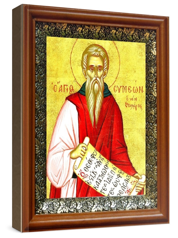 Икона симеон новый богослов (19х22), светлый киот. Лик нанесен методом шелкографии на цельную липовую доску, покрытую левкасом (специальным грунтом под живопись). Использованы минеральные (природные) краски. Размер иконы без киота (см): 13х16, с киотом: 19х22. Киот со стеклом, выполнен из березы и украшен басмой (узор из черненой меди в виде виноградной лозы). Икона освящена.