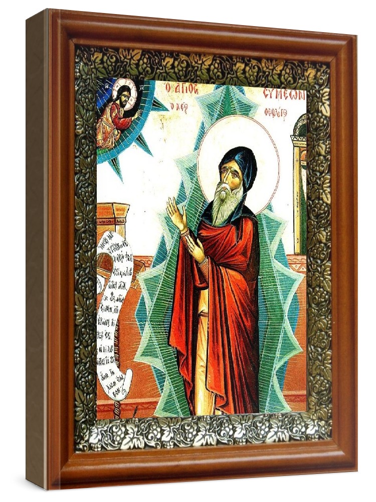 Икона симеон новый богослов (19х22), светлый киот. Лик нанесен методом шелкографии на цельную липовую доску, покрытую левкасом (специальным грунтом под живопись). Использованы минеральные (природные) краски. Размер иконы без киота (см): 13х16, с киотом: 19х22. Киот со стеклом, выполнен из березы и украшен басмой (узор из черненой меди в виде виноградной лозы). Икона освящена.