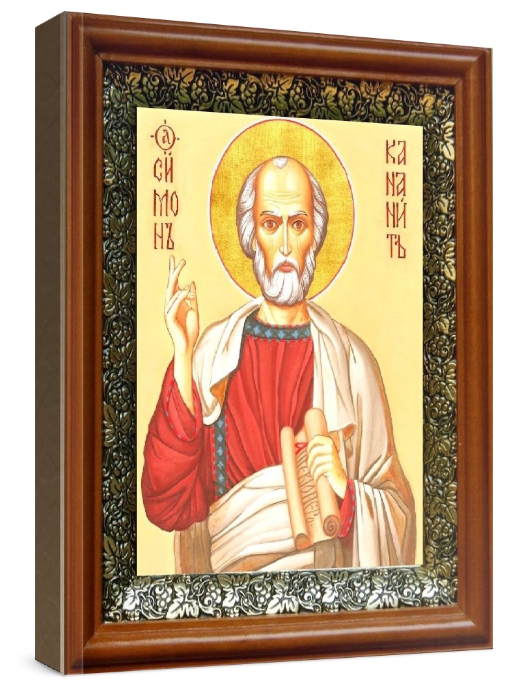 Икона симон кананит (19х22), светлый киот. Лик нанесен методом шелкографии на цельную липовую доску, покрытую левкасом (специальным грунтом под живопись). Использованы минеральные (природные) краски. Размер иконы без киота (см): 13х16, с киотом: 19х22. Киот со стеклом, выполнен из березы и украшен басмой (узор из черненой меди в виде виноградной лозы). Икона освящена.