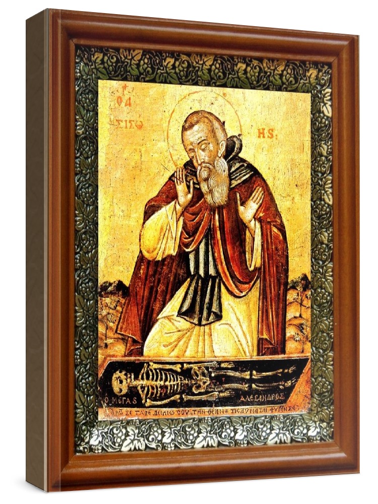 Икона сисой великий (19х22), светлый киот. Лик нанесен методом шелкографии на цельную липовую доску, покрытую левкасом (специальным грунтом под живопись). Использованы минеральные (природные) краски. Размер иконы без киота (см): 13х16, с киотом: 19х22. Киот со стеклом, выполнен из березы и украшен басмой (узор из черненой меди в виде виноградной лозы). Икона освящена.