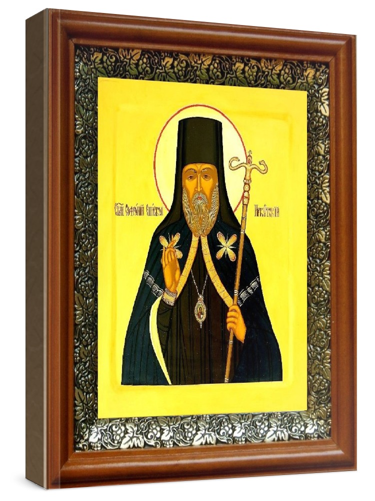 Икона софроний иркутский (19х22), светлый киот. Лик нанесен методом шелкографии на цельную липовую доску, покрытую левкасом (специальным грунтом под живопись). Использованы минеральные (природные) краски. Размер иконы без киота (см): 13х16, с киотом: 19х22. Киот со стеклом, выполнен из березы и украшен басмой (узор из черненой меди в виде виноградной лозы). Икона освящена.