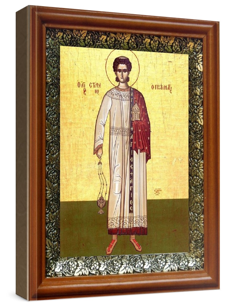 Икона стефан, первомученик и архидиакон (19х22), светлый киот. Лик нанесен методом шелкографии на цельную липовую доску, покрытую левкасом (специальным грунтом под живопись). Использованы минеральные (природные) краски. Размер иконы без киота (см): 13х16, с киотом: 19х22. Киот со стеклом, выполнен из березы и украшен басмой (узор из черненой меди в виде виноградной лозы). Икона освящена.