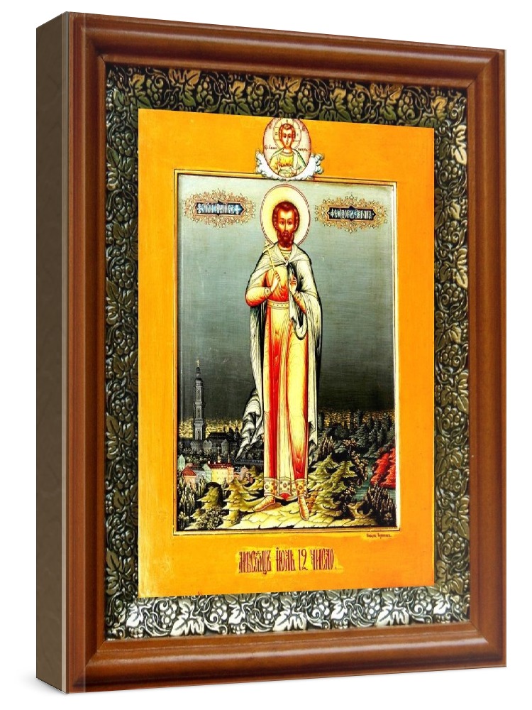 Икона феодор варяг (19х22), светлый киот. Лик нанесен методом шелкографии на цельную липовую доску, покрытую левкасом (специальным грунтом под живопись). Использованы минеральные (природные) краски. Размер иконы без киота (см): 13х16, с киотом: 19х22. Киот со стеклом, выполнен из березы и украшен басмой (узор из черненой меди в виде виноградной лозы). Икона освящена.