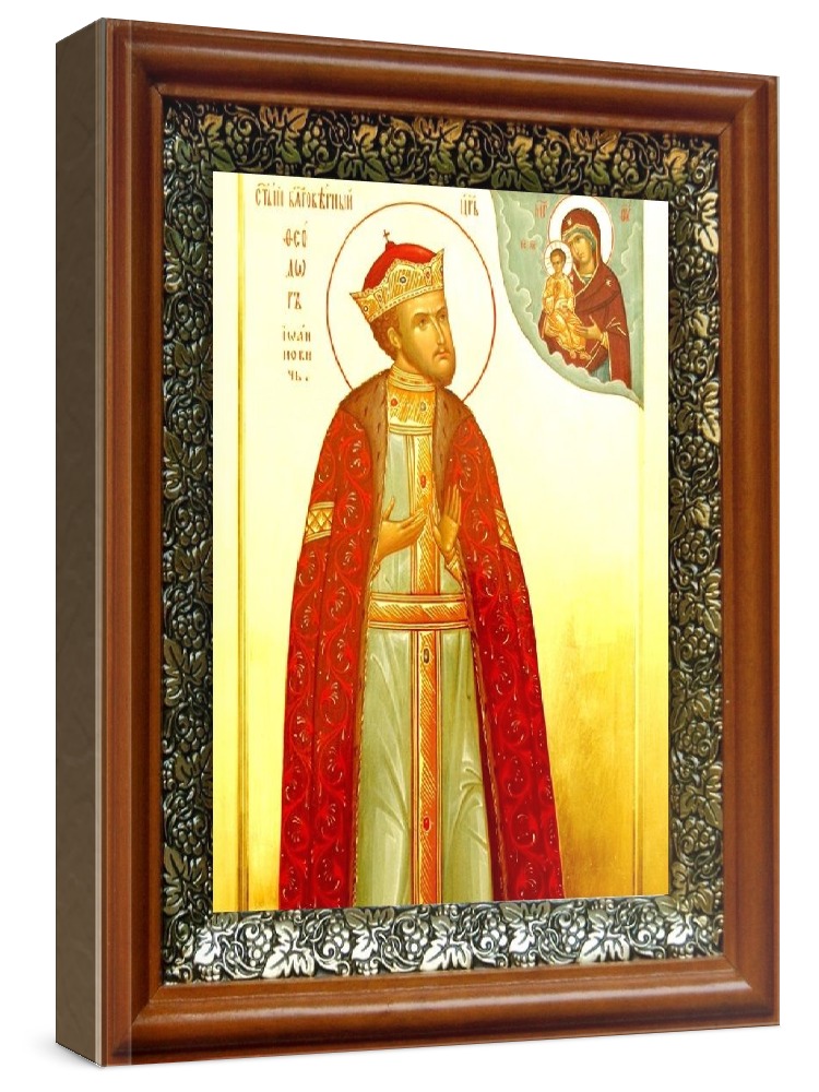 Икона феодор московский, царь (19х22), светлый киот. Лик нанесен методом шелкографии на цельную липовую доску, покрытую левкасом (специальным грунтом под живопись). Использованы минеральные (природные) краски. Размер иконы без киота (см): 13х16, с киотом: 19х22. Киот со стеклом, выполнен из березы и украшен басмой (узор из черненой меди в виде виноградной лозы). Икона освящена.