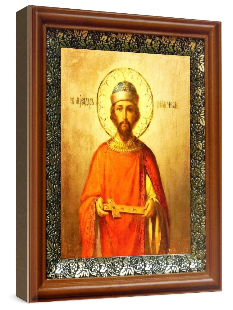 Икона феодор черниговский (19х22), светлый киот. Лик нанесен методом шелкографии на цельную липовую доску, покрытую левкасом (специальным грунтом под живопись). Использованы минеральные (природные) краски. Размер иконы без киота (см): 13х16, с киотом: 19х22. Киот со стеклом, выполнен из березы и украшен басмой (узор из черненой меди в виде виноградной лозы). Икона освящена.