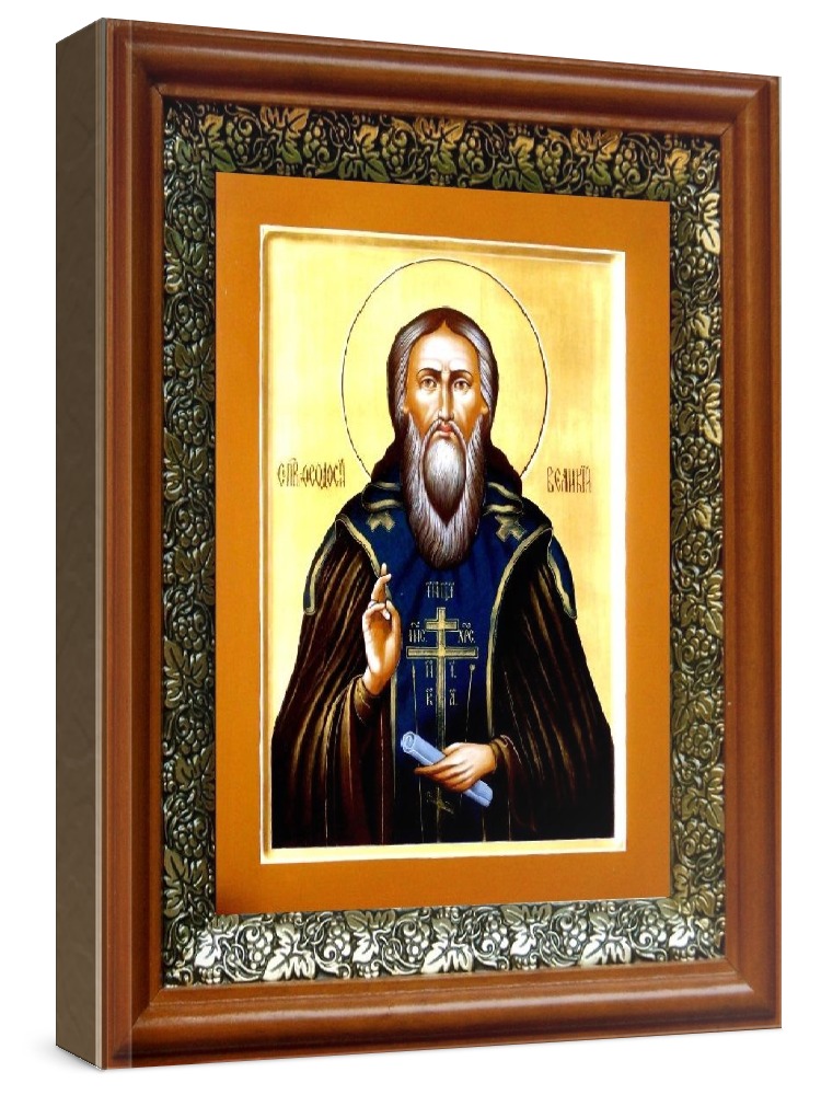 Икона феодосий великий (19х22), светлый киот. Лик нанесен методом шелкографии на цельную липовую доску, покрытую левкасом (специальным грунтом под живопись). Использованы минеральные (природные) краски. Размер иконы без киота (см): 13х16, с киотом: 19х22. Киот со стеклом, выполнен из березы и украшен басмой (узор из черненой меди в виде виноградной лозы). Икона освящена.