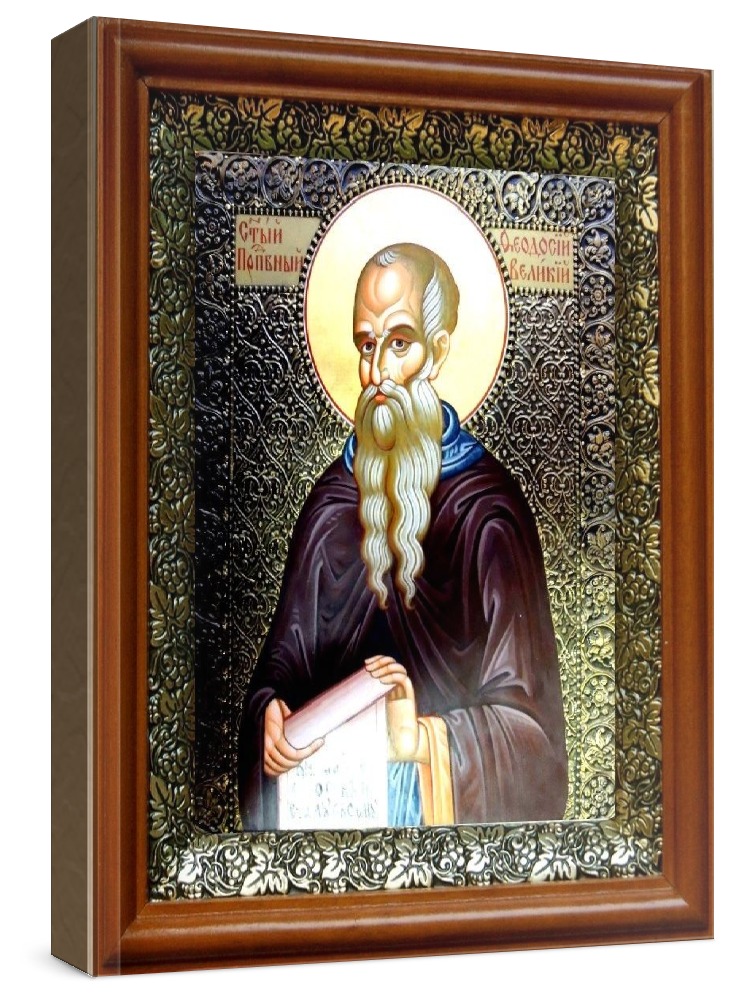 Икона феодосий великий (19х22), светлый киот. Лик нанесен методом шелкографии на цельную липовую доску, покрытую левкасом (специальным грунтом под живопись). Использованы минеральные (природные) краски. Размер иконы без киота (см): 13х16, с киотом: 19х22. Киот со стеклом, выполнен из березы и украшен басмой (узор из черненой меди в виде виноградной лозы). Икона освящена.