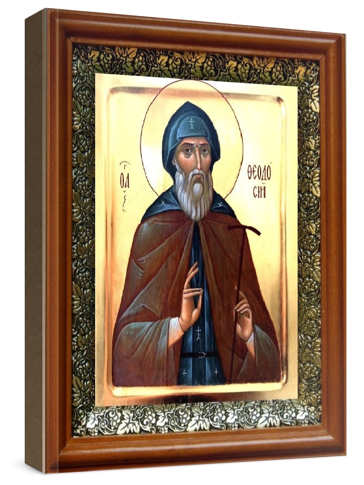 Икона феодосий великий (19х22), светлый киот. Лик нанесен методом шелкографии на цельную липовую доску, покрытую левкасом (специальным грунтом под живопись). Использованы минеральные (природные) краски. Размер иконы без киота (см): 13х16, с киотом: 19х22. Киот со стеклом, выполнен из березы и украшен басмой (узор из черненой меди в виде виноградной лозы). Икона освящена.