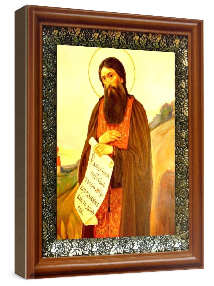 Икона феодосий печерский (19х22), светлый киот. Лик нанесен методом шелкографии на цельную липовую доску, покрытую левкасом (специальным грунтом под живопись). Использованы минеральные (природные) краски. Размер иконы без киота (см): 13х16, с киотом: 19х22. Киот со стеклом, выполнен из березы и украшен басмой (узор из черненой меди в виде виноградной лозы). Икона освящена.