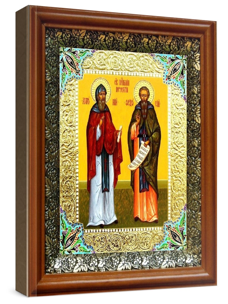 Икона феодосий и антоний печерские (19х22), светлый киот. Лик нанесен методом шелкографии на цельную липовую доску, покрытую левкасом (специальным грунтом под живопись). Использованы минеральные (природные) краски. Размер иконы без киота (см): 13х16, с киотом: 19х22. Киот со стеклом, выполнен из березы и украшен басмой (узор из черненой меди в виде виноградной лозы). Икона освящена.