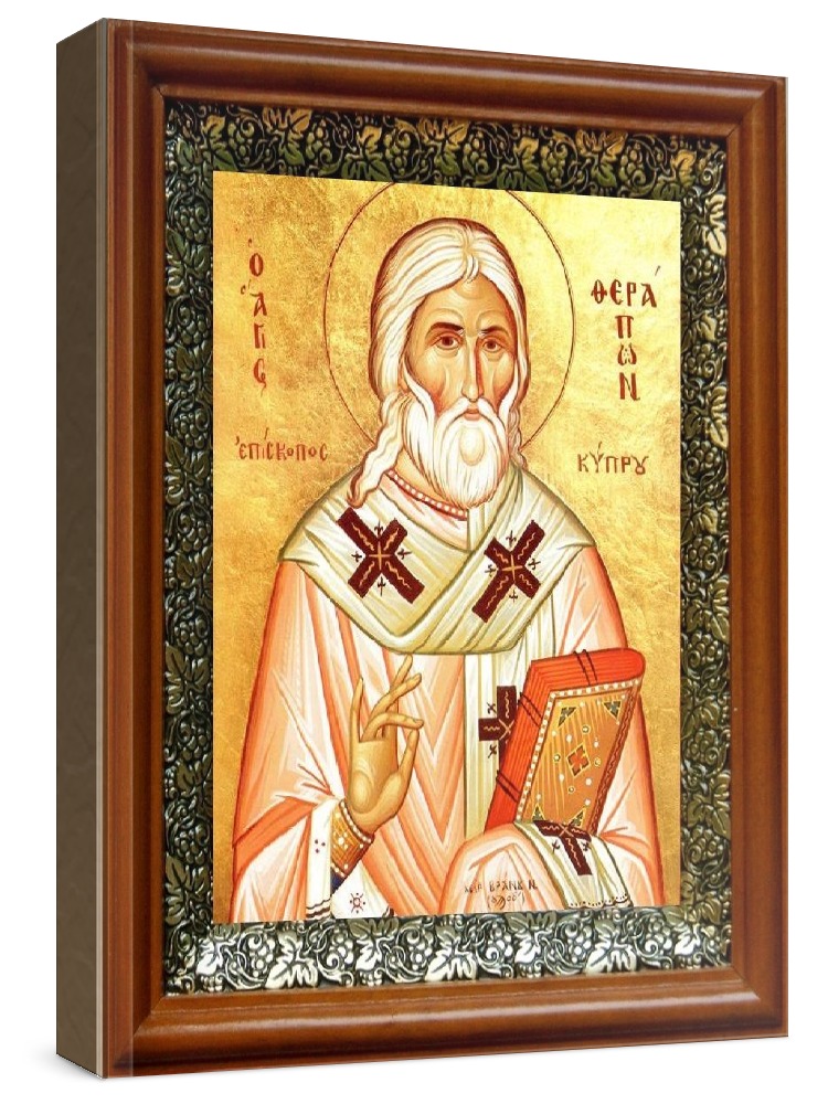 Икона ферапонт кипрский (19х22), светлый киот. Лик нанесен методом шелкографии на цельную липовую доску, покрытую левкасом (специальным грунтом под живопись). Использованы минеральные (природные) краски. Размер иконы без киота (см): 13х16, с киотом: 19х22. Киот со стеклом, выполнен из березы и украшен басмой (узор из черненой меди в виде виноградной лозы). Икона освящена.