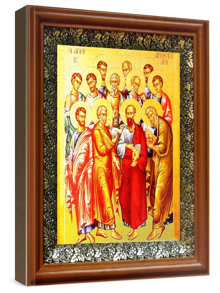 Икона 12 апостолов (19х22), светлый киот. Лик нанесен методом шелкографии на цельную липовую доску, покрытую левкасом (специальным грунтом под живопись). Использованы минеральные (природные) краски. Размер иконы без киота (см): 13х16, с киотом: 19х22. Киот со стеклом, выполнен из березы и украшен басмой (узор из черненой меди в виде виноградной лозы). Икона освящена.