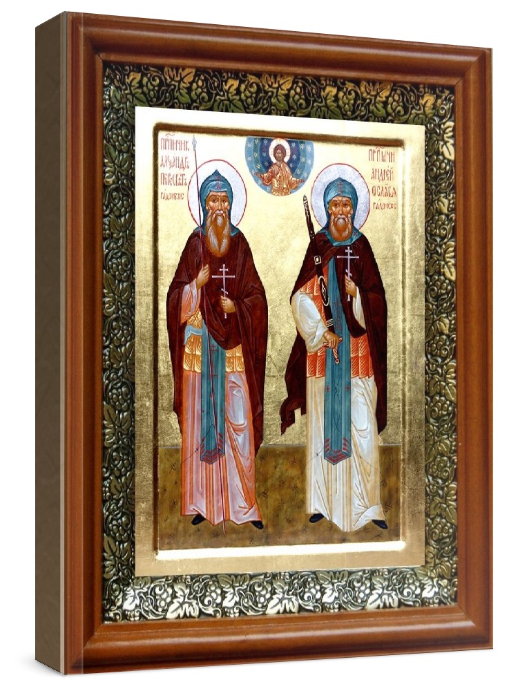 Икона александр пересвет и андрей ослябя (19х22), светлый киот. Лик нанесен методом шелкографии на цельную липовую доску, покрытую левкасом (специальным грунтом под живопись). Использованы минеральные (природные) краски. Размер иконы без киота (см): 13х16, с киотом: 19х22. Киот со стеклом, выполнен из березы и украшен басмой (узор из черненой меди в виде виноградной лозы). Икона освящена.