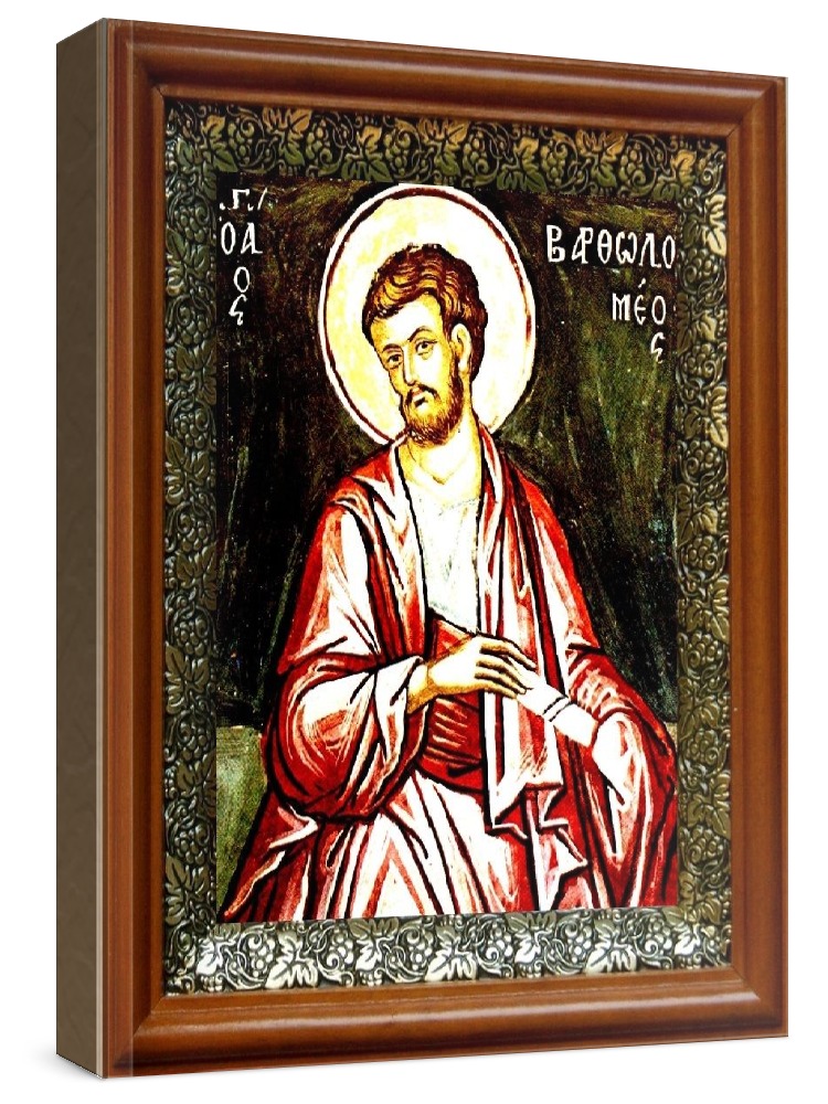 Икона апостол варфоломей (19х22), светлый киот. Лик нанесен методом шелкографии на цельную липовую доску, покрытую левкасом (специальным грунтом под живопись). Использованы минеральные (природные) краски. Размер иконы без киота (см): 13х16, с киотом: 19х22. Киот со стеклом, выполнен из березы и украшен басмой (узор из черненой меди в виде виноградной лозы). Икона освящена.