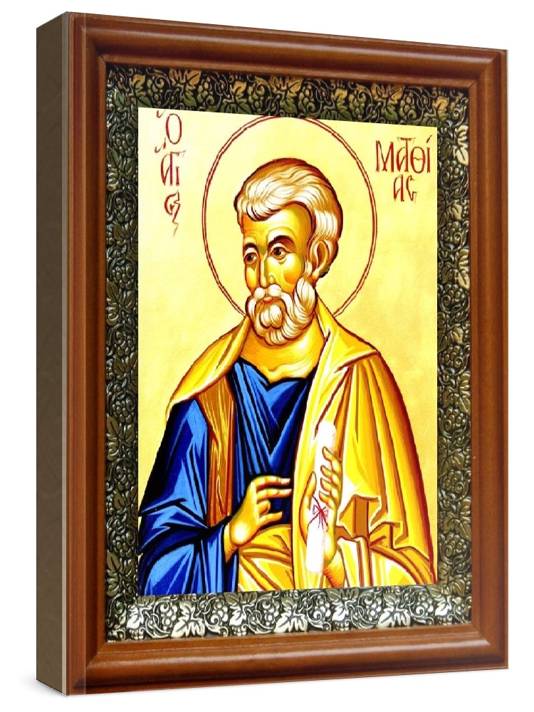 Икона апостол матфий (19х22), светлый киот. Лик нанесен методом шелкографии на цельную липовую доску, покрытую левкасом (специальным грунтом под живопись). Использованы минеральные (природные) краски. Размер иконы без киота (см): 13х16, с киотом: 19х22. Киот со стеклом, выполнен из березы и украшен басмой (узор из черненой меди в виде виноградной лозы). Икона освящена.