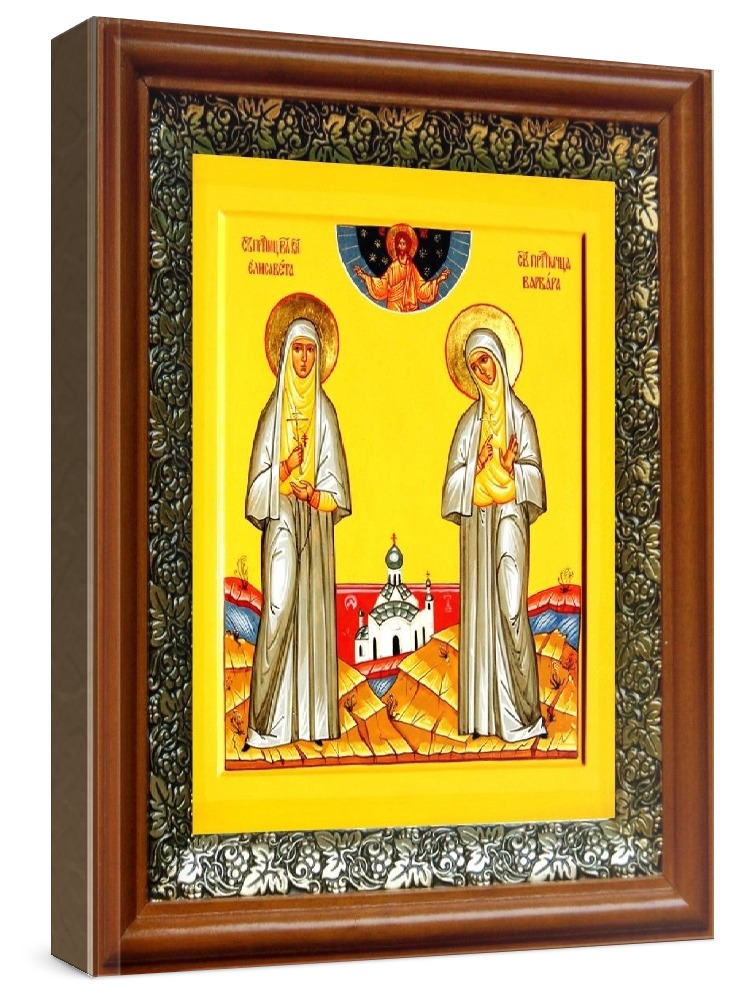 Икона елизавета и варвара (19х22), светлый киот. Лик нанесен методом шелкографии на цельную липовую доску, покрытую левкасом (специальным грунтом под живопись). Использованы минеральные (природные) краски. Размер иконы без киота (см): 13х16, с киотом: 19х22. Киот со стеклом, выполнен из березы и украшен басмой (узор из черненой меди в виде виноградной лозы). Икона освящена.