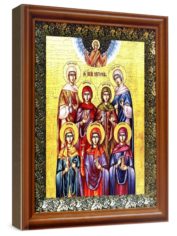 Икона жены мироносицы (19х22), светлый киот. Лик нанесен методом шелкографии на цельную липовую доску, покрытую левкасом (специальным грунтом под живопись). Использованы минеральные (природные) краски. Размер иконы без киота (см): 13х16, с киотом: 19х22. Киот со стеклом, выполнен из березы и украшен басмой (узор из черненой меди в виде виноградной лозы). Икона освящена.