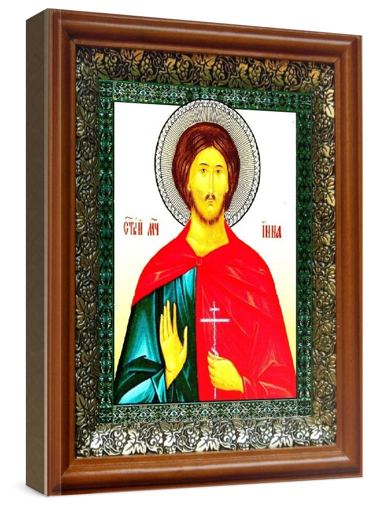 Икона инна новодунский (19х22), светлый киот. Лик нанесен методом шелкографии на цельную липовую доску, покрытую левкасом (специальным грунтом под живопись). Использованы минеральные (природные) краски. Размер иконы без киота (см): 13х16, с киотом: 19х22. Киот со стеклом, выполнен из березы и украшен басмой (узор из черненой меди в виде виноградной лозы). Икона освящена.