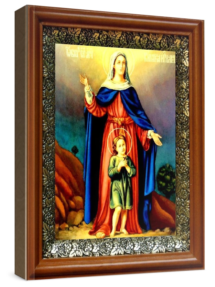 Икона кирик и иулитта (19х22), светлый киот. Лик нанесен методом шелкографии на цельную липовую доску, покрытую левкасом (специальным грунтом под живопись). Использованы минеральные (природные) краски. Размер иконы без киота (см): 13х16, с киотом: 19х22. Киот со стеклом, выполнен из березы и украшен басмой (узор из черненой меди в виде виноградной лозы). Икона освящена.