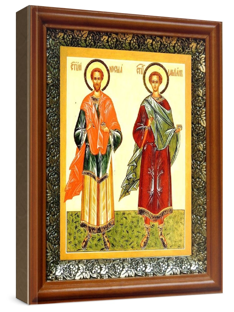Икона косьма и дамиан (19х22), светлый киот. Лик нанесен методом шелкографии на цельную липовую доску, покрытую левкасом (специальным грунтом под живопись). Использованы минеральные (природные) краски. Размер иконы без киота (см): 13х16, с киотом: 19х22. Киот со стеклом, выполнен из березы и украшен басмой (узор из черненой меди в виде виноградной лозы). Икона освящена.