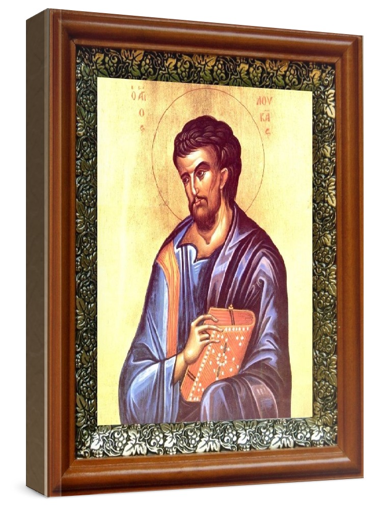 Икона лука, апостол (19х22), светлый киот. Лик нанесен методом шелкографии на цельную липовую доску, покрытую левкасом (специальным грунтом под живопись). Использованы минеральные (природные) краски. Размер иконы без киота (см): 13х16, с киотом: 19х22. Киот со стеклом, выполнен из березы и украшен басмой (узор из черненой меди в виде виноградной лозы). Икона освящена.