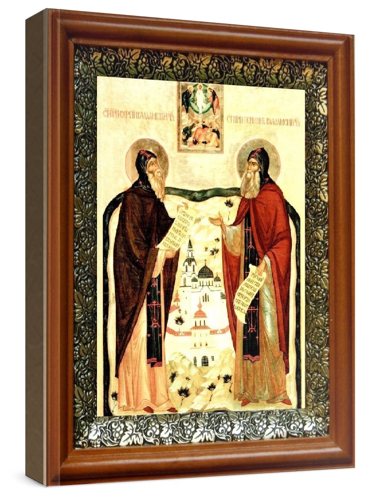 Икона сергий и герман валаамские (19х22), светлый киот. Лик нанесен методом шелкографии на цельную липовую доску, покрытую левкасом (специальным грунтом под живопись). Использованы минеральные (природные) краски. Размер иконы без киота (см): 13х16, с киотом: 19х22. Киот со стеклом, выполнен из березы и украшен басмой (узор из черненой меди в виде виноградной лозы). Икона освящена.