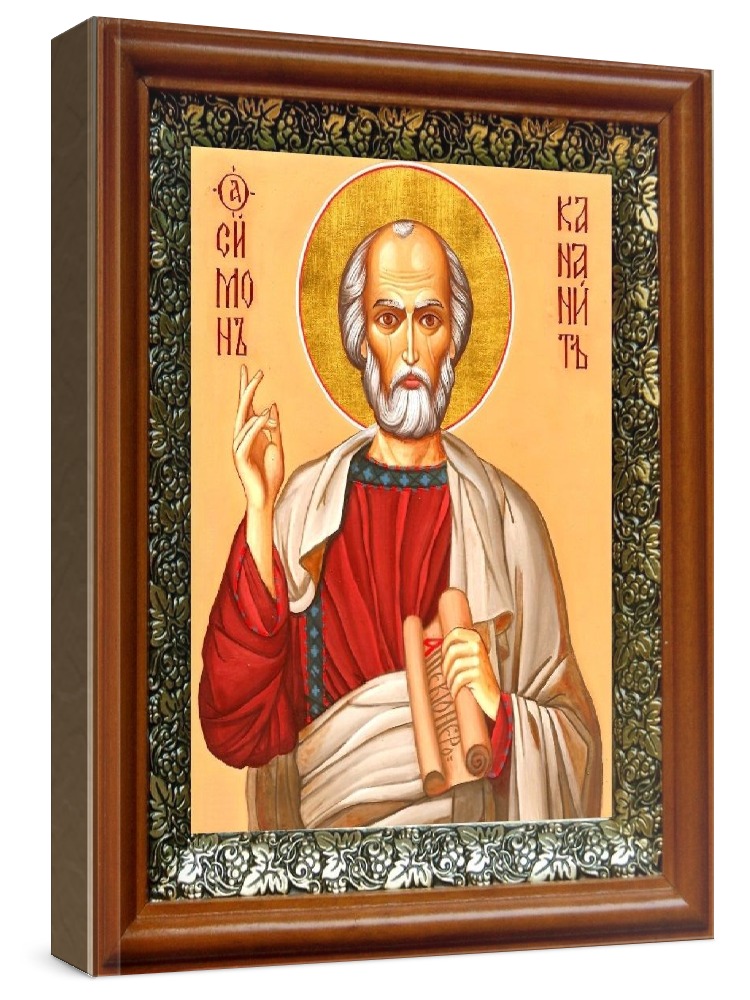 Икона симон кананит (зилот) (19х22), светлый киот. Лик нанесен методом шелкографии на цельную липовую доску, покрытую левкасом (специальным грунтом под живопись). Использованы минеральные (природные) краски. Размер иконы без киота (см): 13х16, с киотом: 19х22. Киот со стеклом, выполнен из березы и украшен басмой (узор из черненой меди в виде виноградной лозы). Икона освящена.
