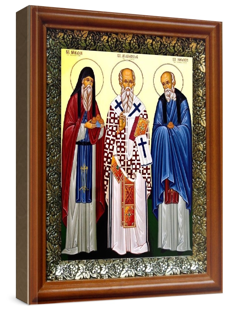 Икона спиридон и никодим печерские (19х22), светлый киот. Лик нанесен методом шелкографии на цельную липовую доску, покрытую левкасом (специальным грунтом под живопись). Использованы минеральные (природные) краски. Размер иконы без киота (см): 13х16, с киотом: 19х22. Киот со стеклом, выполнен из березы и украшен басмой (узор из черненой меди в виде виноградной лозы). Икона освящена.