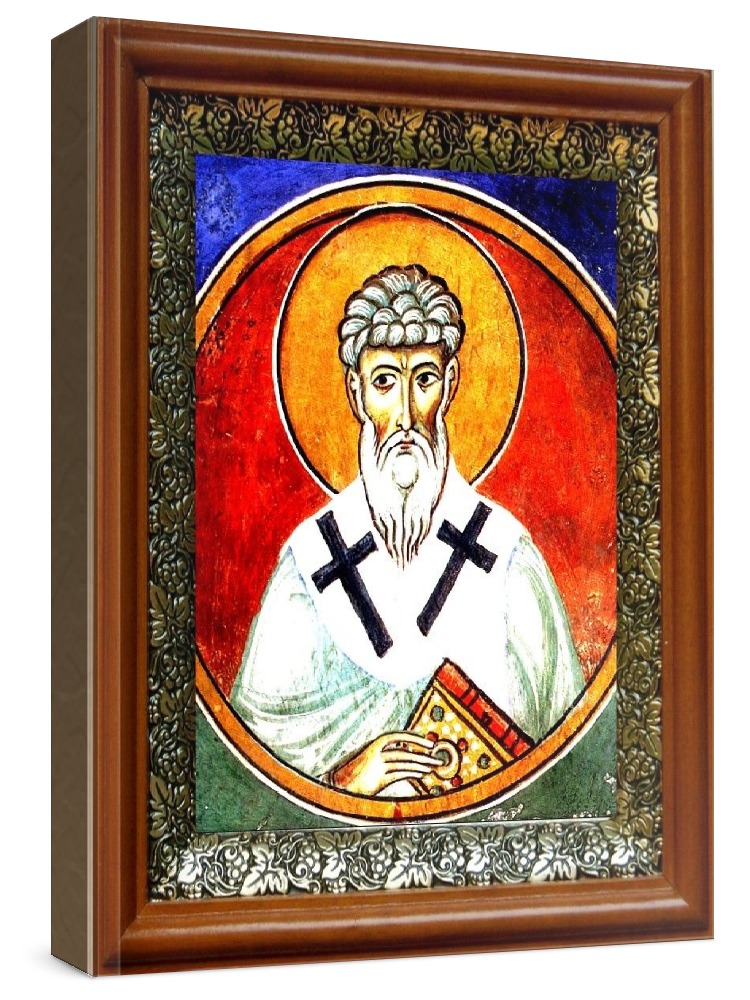 Икона трифиллий левкусийский (19х22), светлый киот. Лик нанесен методом шелкографии на цельную липовую доску, покрытую левкасом (специальным грунтом под живопись). Использованы минеральные (природные) краски. Размер иконы без киота (см): 13х16, с киотом: 19х22. Киот со стеклом, выполнен из березы и украшен басмой (узор из черненой меди в виде виноградной лозы). Икона освящена.