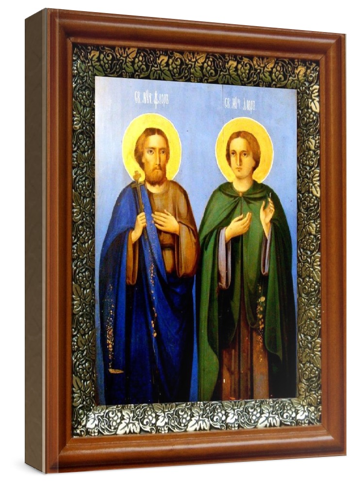 Икона флор и лавр (19х22), светлый киот. Лик нанесен методом шелкографии на цельную липовую доску, покрытую левкасом (специальным грунтом под живопись). Использованы минеральные (природные) краски. Размер иконы без киота (см): 13х16, с киотом: 19х22. Киот со стеклом, выполнен из березы и украшен басмой (узор из черненой меди в виде виноградной лозы). Икона освящена.