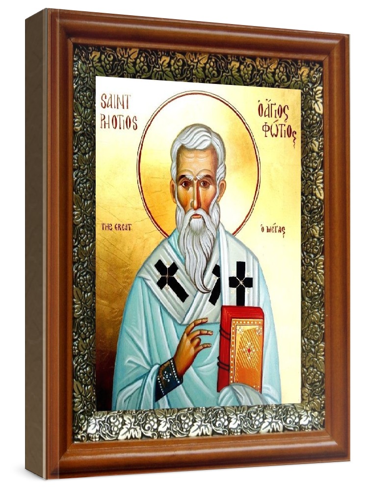 Икона фотий константинопольский (19х22), светлый киот. Лик нанесен методом шелкографии на цельную липовую доску, покрытую левкасом (специальным грунтом под живопись). Использованы минеральные (природные) краски. Размер иконы без киота (см): 13х16, с киотом: 19х22. Киот со стеклом, выполнен из березы и украшен басмой (узор из черненой меди в виде виноградной лозы). Икона освящена.