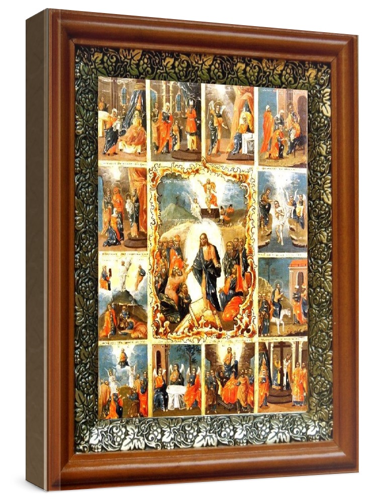 Икона 12 праздников (19х22), светлый киот. Лик нанесен методом шелкографии на цельную липовую доску, покрытую левкасом (специальным грунтом под живопись). Использованы минеральные (природные) краски. Размер иконы без киота (см): 13х16, с киотом: 19х22. Киот со стеклом, выполнен из березы и украшен басмой (узор из черненой меди в виде виноградной лозы). Икона освящена.