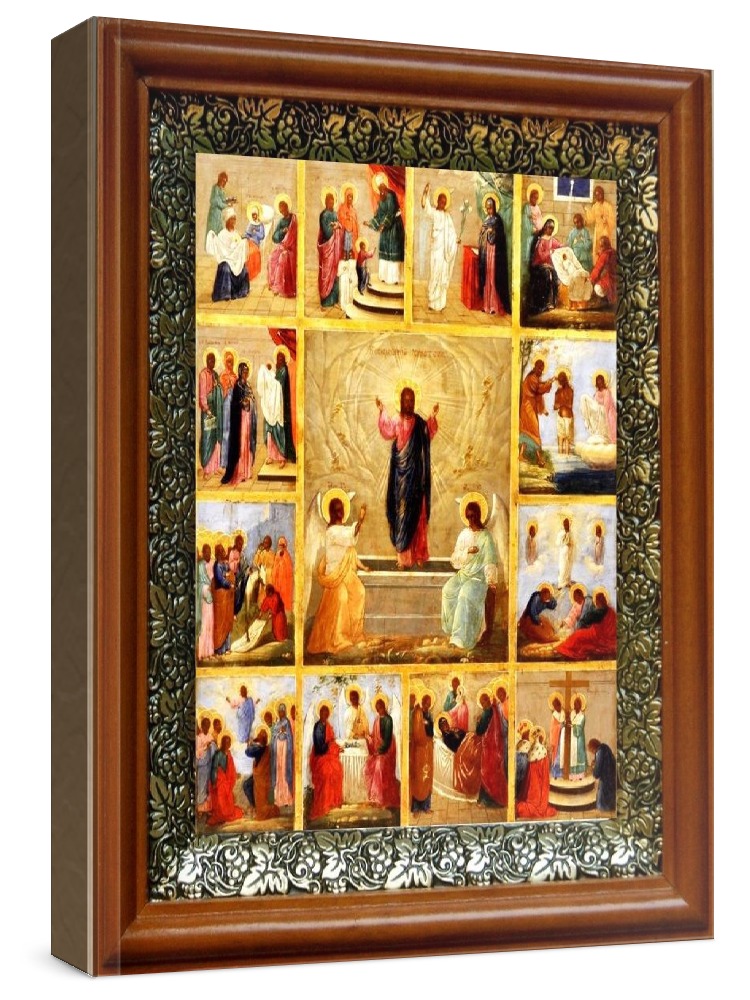 Икона 12 праздников (19х22), светлый киот. Лик нанесен методом шелкографии на цельную липовую доску, покрытую левкасом (специальным грунтом под живопись). Использованы минеральные (природные) краски. Размер иконы без киота (см): 13х16, с киотом: 19х22. Киот со стеклом, выполнен из березы и украшен басмой (узор из черненой меди в виде виноградной лозы). Икона освящена.