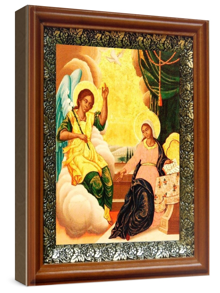 Икона благовещение пресвятой богородицы (19х22), светлый киот. Лик нанесен методом шелкографии на цельную липовую доску, покрытую левкасом (специальным грунтом под живопись). Использованы минеральные (природные) краски. Размер иконы без киота (см): 13х16, с киотом: 19х22. Киот со стеклом, выполнен из березы и украшен басмой (узор из черненой меди в виде виноградной лозы). Икона освящена.