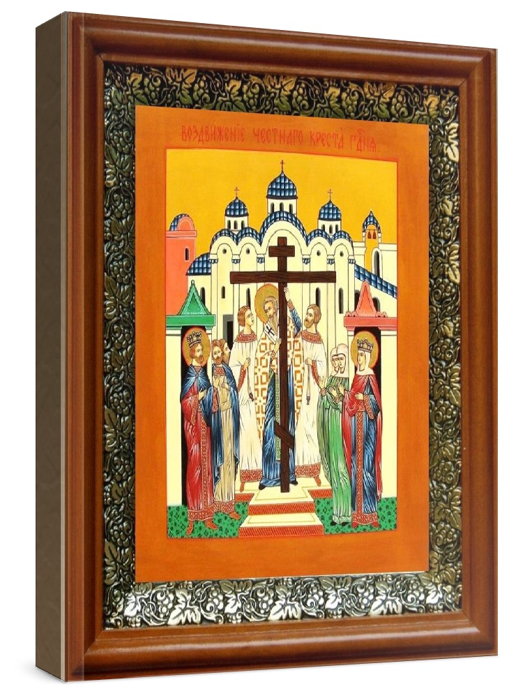 Икона воздвижение креста господня (19х22), светлый киот. Лик нанесен методом шелкографии на цельную липовую доску, покрытую левкасом (специальным грунтом под живопись). Использованы минеральные (природные) краски. Размер иконы без киота (см): 13х16, с киотом: 19х22. Киот со стеклом, выполнен из березы и украшен басмой (узор из черненой меди в виде виноградной лозы). Икона освящена.